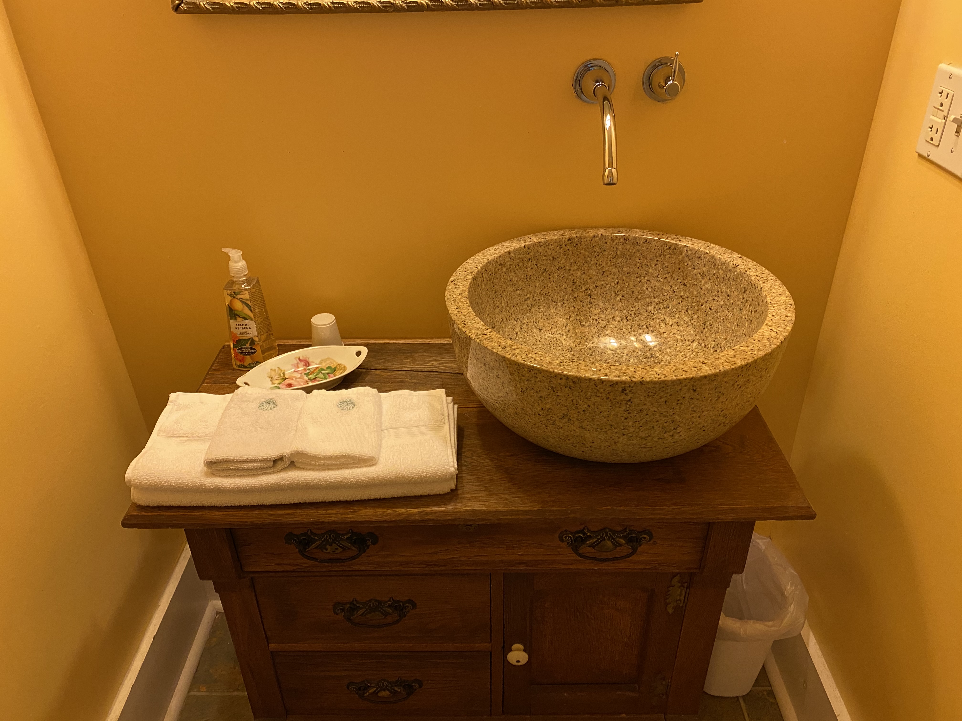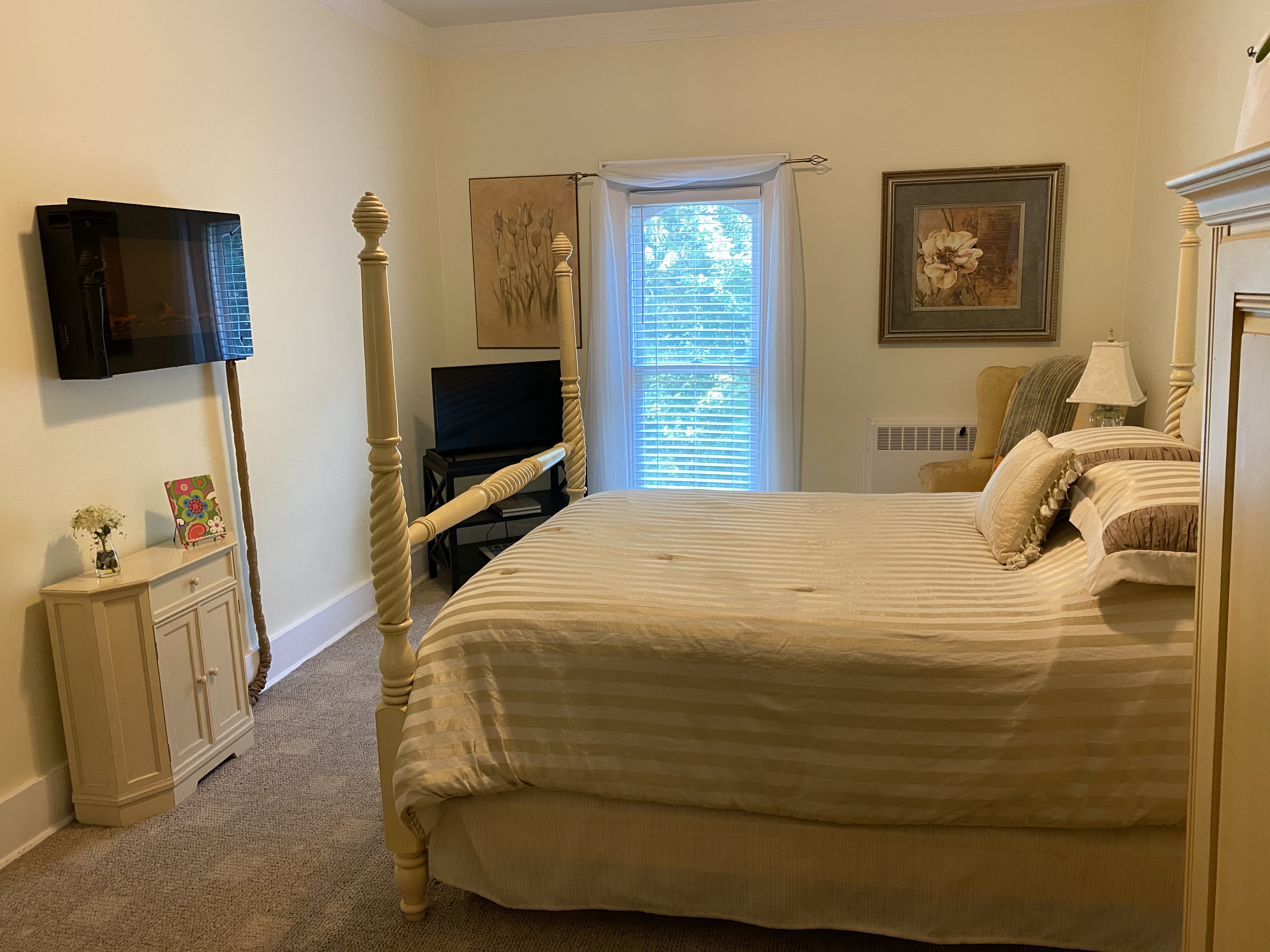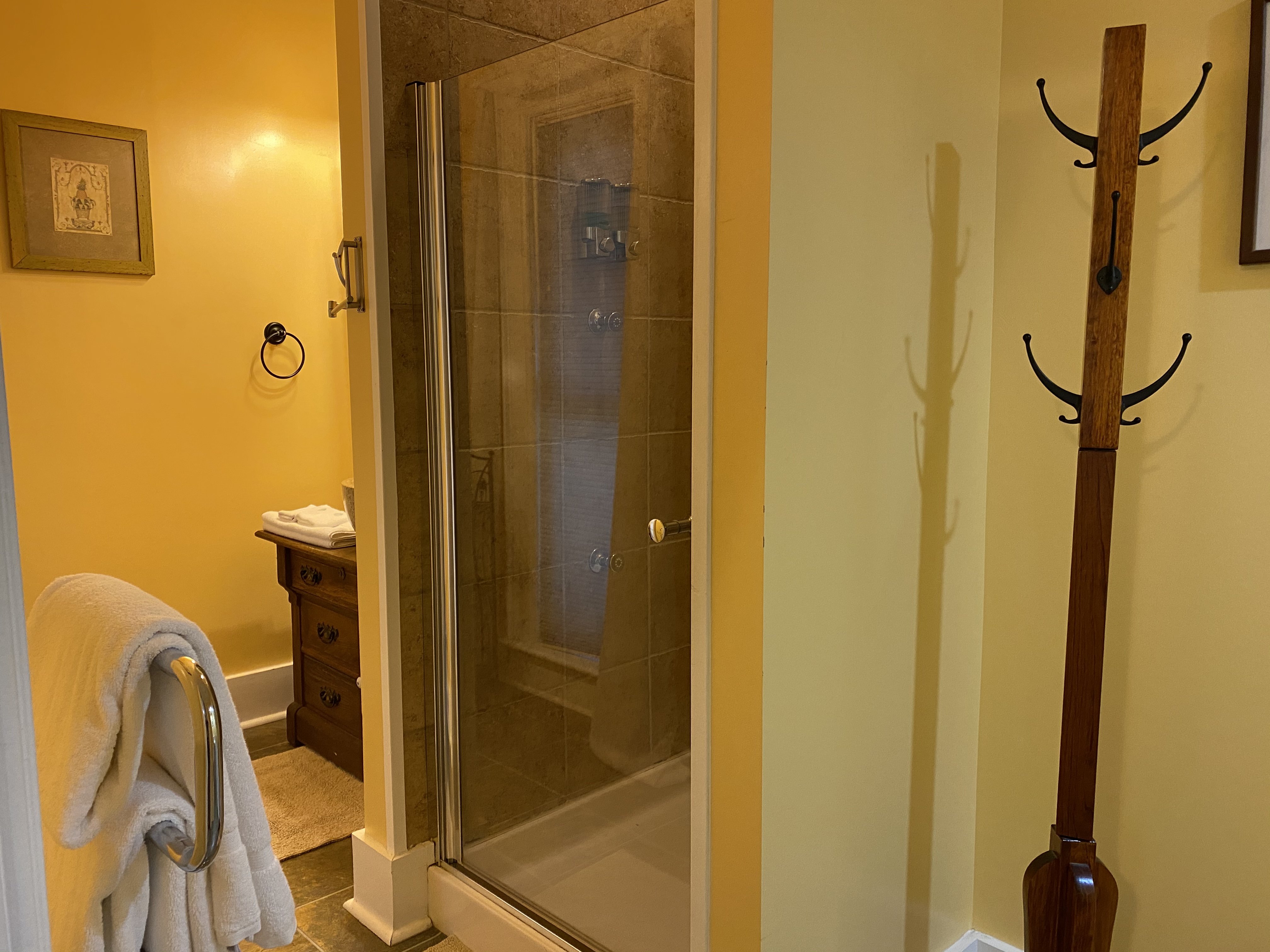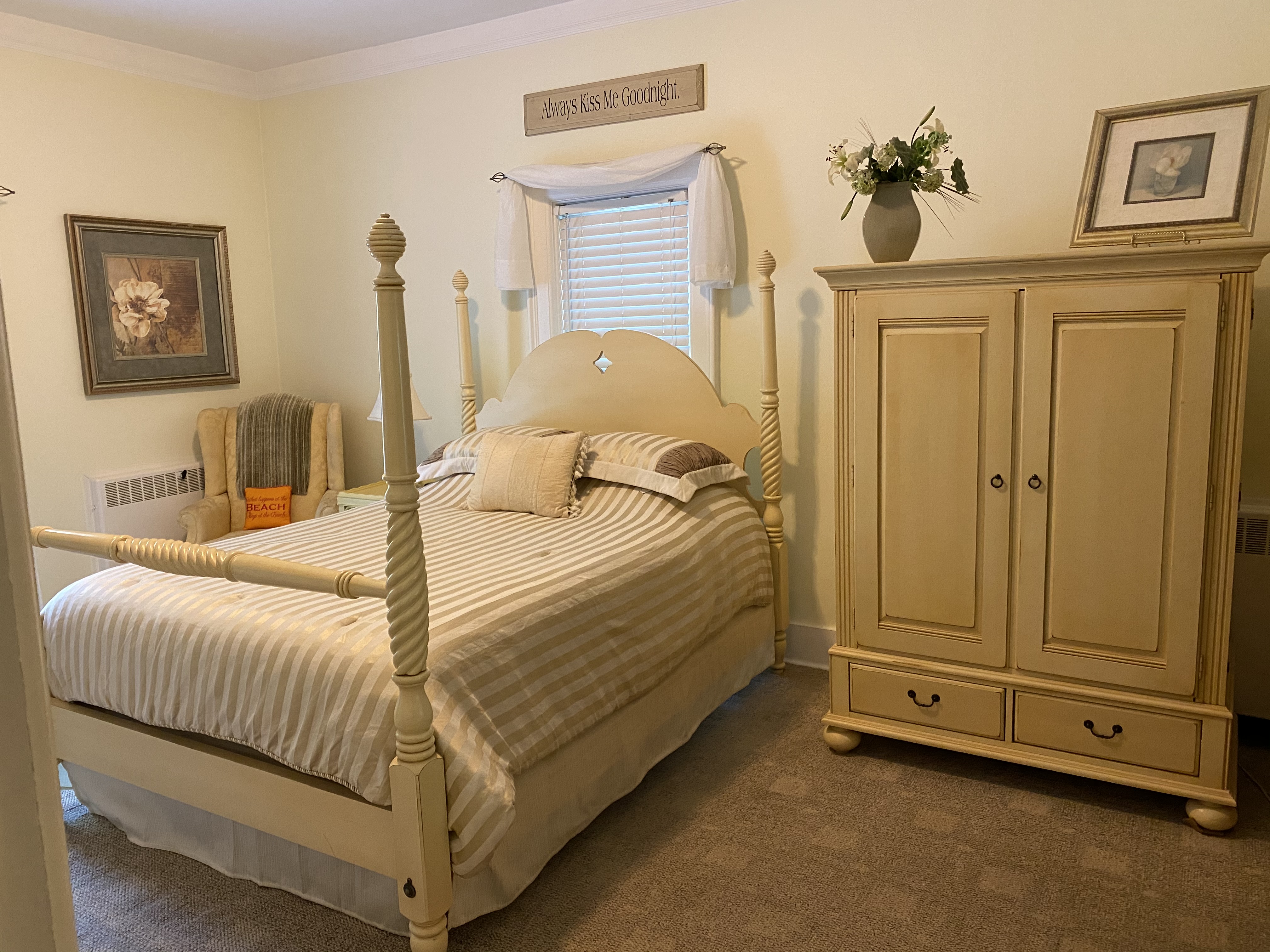 A beautiful sunny room in shades of yellow leaving you with a warm feeling while resting in the 4 poster queen size bed. You will also enjoy the new and modern bath with two person shower and body sprays. A granite vessel sink is is also here to use and admire.